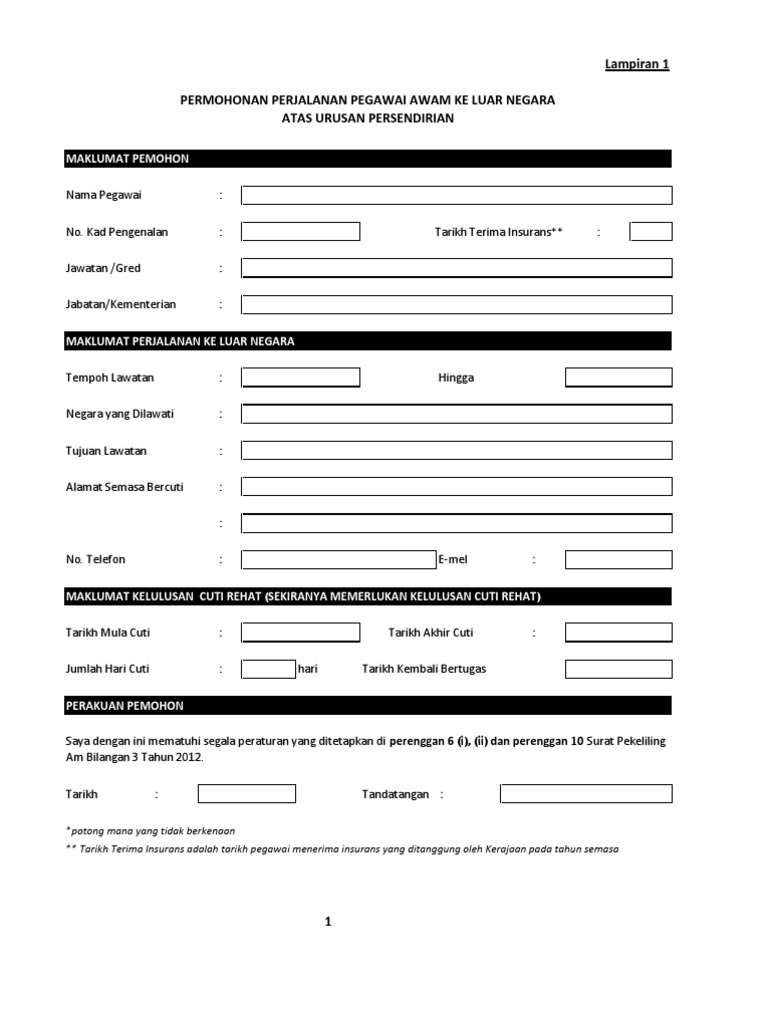Asuransi perjalanan adalah jenis asuransi yang memberikan pertanggungan jika terjadi risiko saat bepergian. Sebelum bercuti atau melancong ke luar negara banyak yang perlu di lakukan. Jika anda tidak begitu memiliki skill yang bisa diandalkan maka kecil kemungkinannya untuk bisa diterima di perusahaan luar negeri. 1 lampiran 1 permohonan perjalanan pegawai awam ke luar negara atas urusan persendirian maklumat pemohon nama pegawai : Ada beberapa negara yang mewajibkan para wisatawan untuk memiliki asuransi perjalanan ke luar negeri. Tegas tan sri razali ismail. Berbagi ke twitter berbagi ke facebook bagikan ke pinterest. Selaras dengan surat penurunan kuasa bagi kelulusan perjalanan ke luar negara atas urusan persendirian yang ditandatangani oleh ybhg. Sebabnya di sana harga jual produk kita dihargai lebih tinggi. 0 ratings0% found this document useful (0 votes). * borang ini perlu diisi untuk pegawai yang sering berulang alik ke luar negara jiran yang bersempadanan dengan. Perjalanan dari us sampai ke malaysia. Borang perubatan 4 • kerja kosong kerajaan.