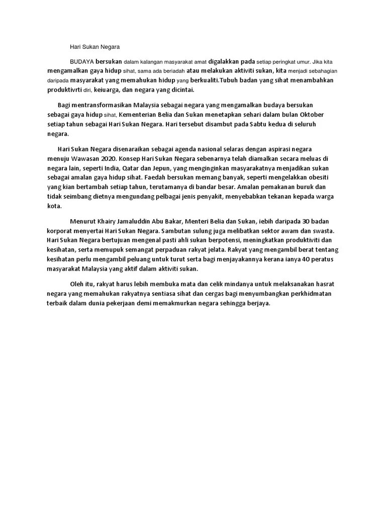 Contoh Karangan Hari Sukan / Sebanyak empat buah rumah sukan telah mengambil bahagian.. Temasya sukan ini telah dirasmikan oleh ahli parlimen parit sulong, yb datuk dr noraini ahmad. Dek kerana kejayaan penganjuran temasya sukan ini, guru besar telah mengumumkan cuti sehati pada hari ahad. Saban hari isu ceti haram atau along sering menghiasi dada akhbar sehingga mangsa tersebut membunuh diri malah membunuh sekeluarga kerana tidak larat lagi menghadapi penganiayaan along yang bermaharajalela. Hari sukan guru besar telah merasmikan hari sukan sekolah saya. Mengatasi masalah kenakalan remaja di era modern 1.