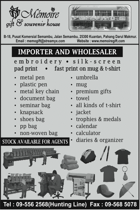 Promotional gift,embroidery services,silk screen services, tee shirt,pen & keychain Address, website, fax, opening hours, etc. Promotional gift,embroidery services,silk screen services, tee shirt,pen & keychain, backpack,backpack. You can also filter out items that offer free shipping, fast delivery or free return. Memoire gift & souvenir house.